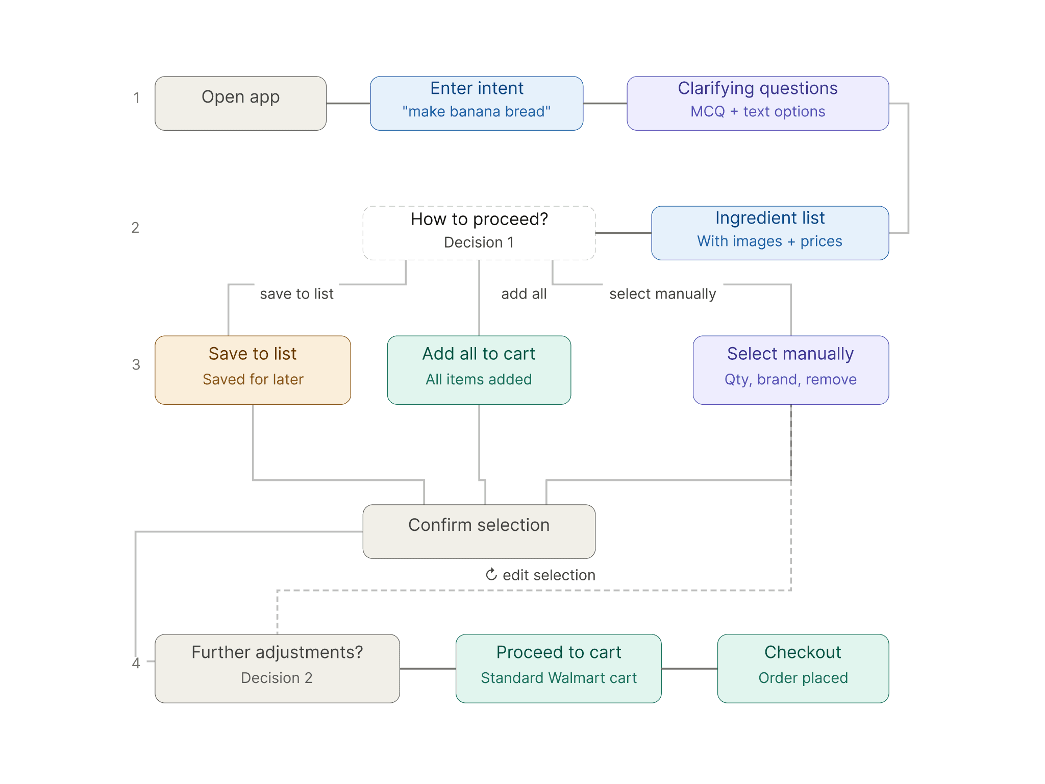 I initially struggled with how to give users manual control while maintaining efficiency. What if they want to change the brand of bananas? But if speed is the priority, surfacing the most popular or best-value options makes more sense. I looked to existing cart patterns for inspiration. By matching what users are already familiar with—quantity selectors, remove icons, edit options—I could offer flexibility without introducing new mental load.