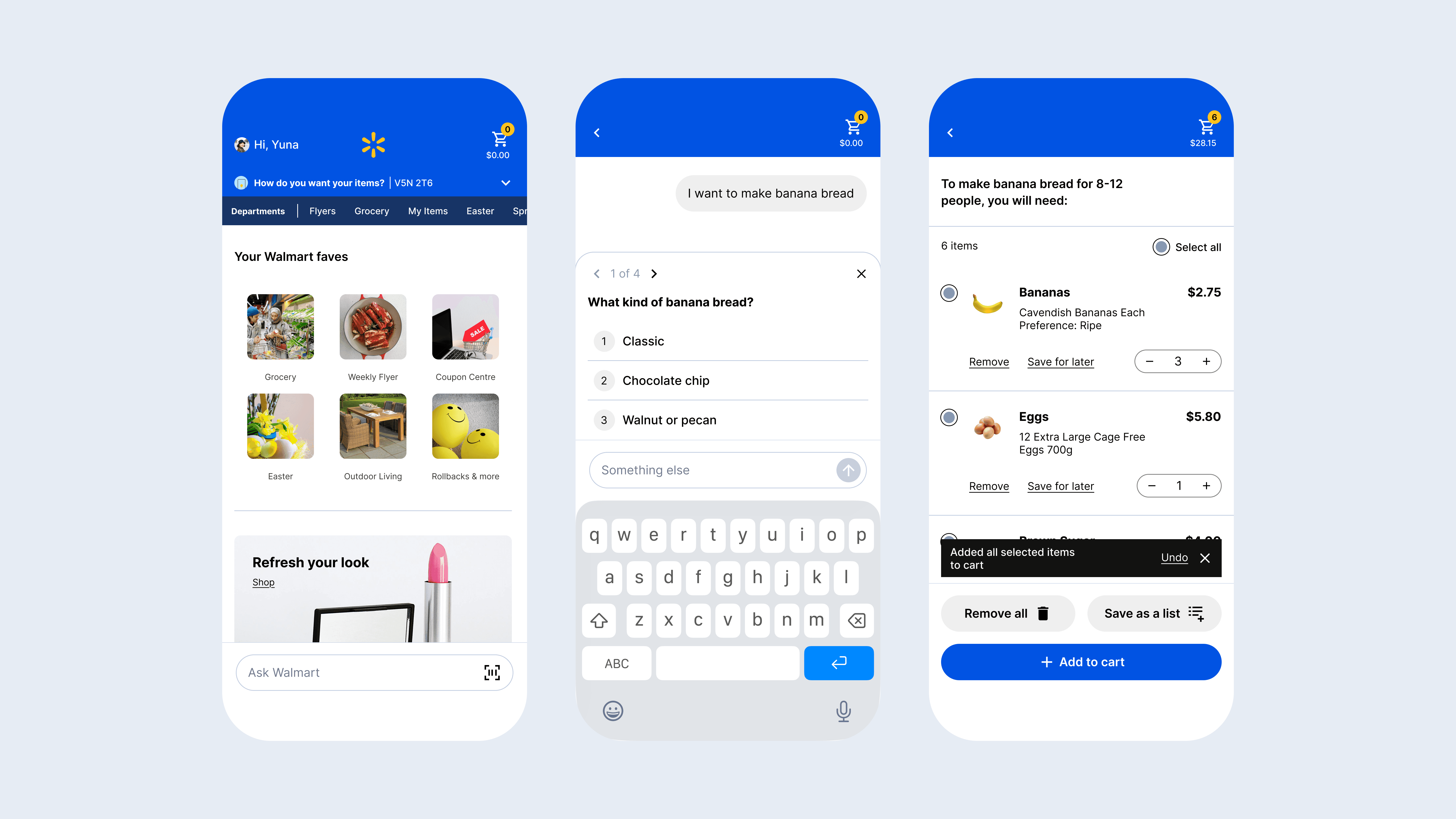 I saw an opportunity to bridge this gap. I designed a conversational AI agent for Walmart that replaces text search with intent-based discovery, uses visual confirmation to build confidence, and manages the cart directly.